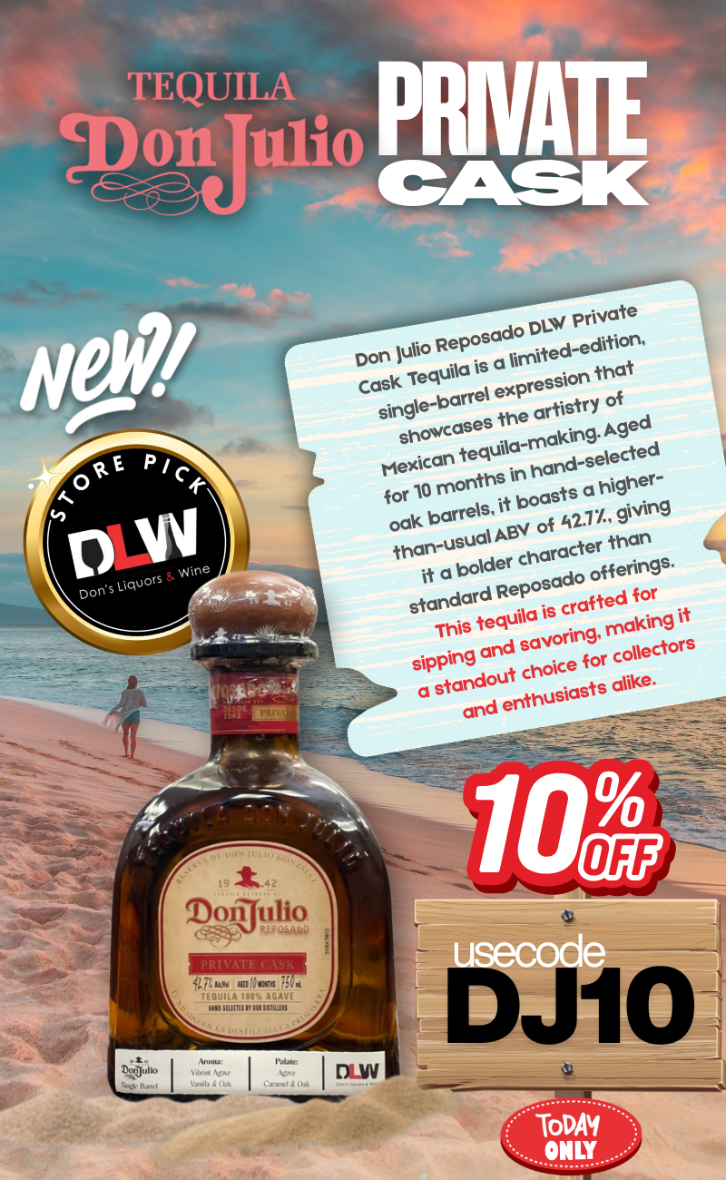 August 10 - Don Julio DLW & Exotico Tequila Don Julio Reposado DLW Private Cask Tequila 750ml $59.99 Shop now Exotico Blanco Tequila 750ml $19.99 Shop now Don Julio 1942 Primavera Tequila $169.99 Shop now Don Julio Anejo 70th Anniversary Tequila $94.99 Shop now Don Julio 1942 Tequila $209.99 Shop now Clase Azul Mezcal Clase Azul Mezcal San Luis Potosi 750ml $439.99 Shop now Tequila Ocho Single Estate La Mula Extra Anejo Tequila 750ml $199.99 Shop now Weller 12 Year Bourbon 750ml + Penelope Four Grain Wheated Bourbon 750ml 2 Bottle Combo $199.99 Shop now Eagle Rare 12 Year Kentucky Straight Bourbon Whiskey 750ml $289.99 Shop now Rare Character 13 Year Exceptional Series Gen 3 E-TN-98 Bourbon 750ml $724.99 Shop now Wolves x Willett 10 Year Blended Rye Whiskey 750ml $249.99 Shop now Barrell Bourbon Decade 20 Year Double Cask Finish Whiskey 750ml $199.99 Shop now Old Carter Barrel Strength Batch 14 American Whiskey 2025 750ml $379.99 Shop now Little Book Chapter 9 "None For Granted" Blended American Whiskey 2025 Release 750ml $179.99 Shop now Buffalo Trace Bourbon Whiskey 750ml 6 Bottle Case - Free Shipping $199.99 Shop now No longer want to receive these emails? Unsubscribe. Don's Liquors & Wine 1053 E. Capitol Express Way San Jose, Ca 95121