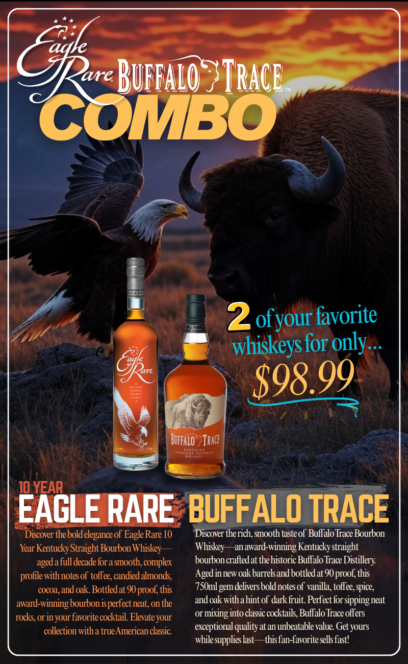 August 15 - Buffalo Trace + Eagle Rare Combo Eagle Rare 10 Year Bourbon 750ml + Buffalo Trace Bourbon 750ml 2 Bottle Combo $98.99 Shop now Eagle Rare 10 Year Kentucky Straight Bourbon Whiskey 750ml $89.99 Shop now Buffalo Trace Bourbon Whiskey 750ml $29.99 Shop now Buffalo Trace Bourbon Whiskey 750ml 12 Bottle Case - Free Shipping $349.99 Shop now Buffalo Trace 'Prohibition Collection' 2025 Bourbon Whiskey Set $3,299.99 Shop now Buffalo Trace O.F.C. Vintage 2006 Bourbon Whiskey 750ml $2,499.99 Shop now Weller 12 Year Bourbon 750ml + Penelope Four Grain Wheated Bourbon 750ml 2 Bottle Combo $199.99 Shop now Hand Barrel Double Oak Kentucky Straight Bourbon Whiskey 750ml $83.99 Shop now Willett Family Estate 10 Year Rye Barrel #1518 "Ashes To Ashes" 750ml $699.99 Shop now Wolves x Willett 10 Year Blended Rye Whiskey 750ml $249.99 Shop now Don Julio Reposado DLW Private Cask Tequila 750ml $59.99 Shop now Garrison Brothers DLW Single Barrel Cask Strength Bourbon Whiskey 133 Proof 750ml $199.99 Shop now 1792 Single Barrel DLW Store Pick Bourbon $79.99 Shop now 291 Barrel Proof Colorado Bourbon Whiskey DLW #612 Single Barrel 750ml $109.99 Shop now Angel's Envy Port Barrel Finished Bourbon Whiskey DLW Store Pick 110 Proof $89.99 Shop now No longer want to receive these emails? Unsubscribe. Don's Liquors & Wine 1053 E. Capitol Express Way San Jose, Ca 95121