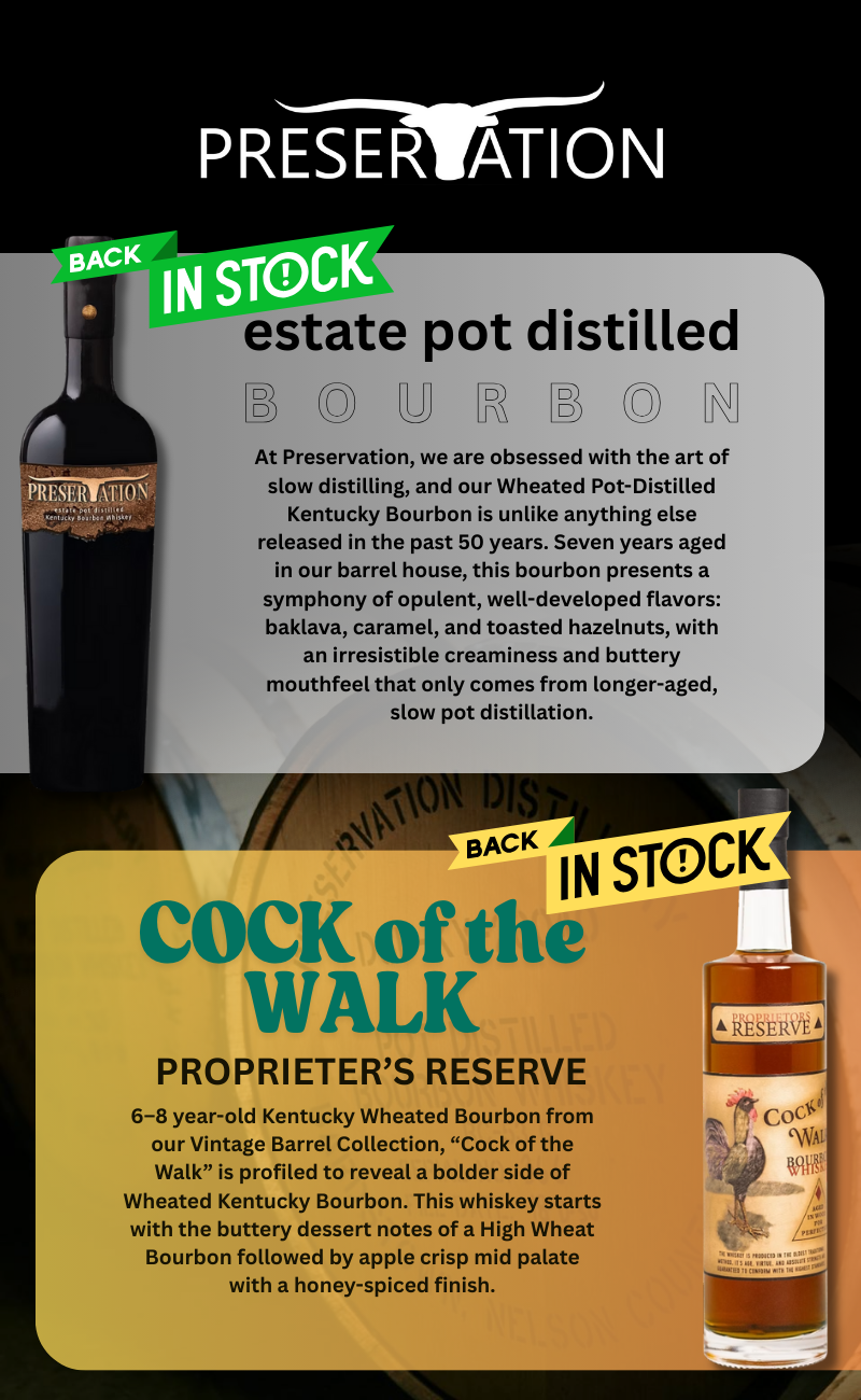 September 3 - Preservation & Old Bardstown Restocks Preservation Estate Pot Distilled Bourbon Whiskey 750ml $134.99 Shop now Preservation Cock of the Walk Proprietor's Reserve Wheated Bourbon 750ml $124.99 Shop now Willett Distillery Old Bardstown Estate 750ml $52.99 Shop now Wolves x Willett 10 Year Blended Rye Whiskey 750ml $249.99 Shop now Willett 8 Year Wheated Kentucky Straight Bourbon Whiskey 750ml $299.99 Shop now Willett Family Estate 10 Year Barrel #2350 "Ticket to Ryed" 750ml $599.99 Shop now Old Carter Barrel Strength Batch 14 American Whiskey 2025 750ml $379.99 Shop now Blanton's Original + 291 Barrel Proof Colorado Single Barrel DLW Bourbon Whiskey Domestic 750ml 2 Bottle Combo $199.99 Shop now Old Fitzgerald Bottled In Bond 2025 Spring Release 9 Year 750ml $479.99 Shop now Old Forester President's Choice Straight Rye Whisky 700ml $549.99 Shop now Old Forester President's Choice Straight Bourbon Whisky 700ml $599.99 Shop now Gold Bar Blend 117 Joe Montana Collection 16yr Whiskey + Patch $174.99 Shop now Aberfeldy 12 Year Old The Golden Dram Gift Tin Scotch Whisky $49.99 Shop now Aberfeldy Single Malt Scotch Whisky Tasting Collection $64.99 Shop now No longer want to receive these emails? Unsubscribe. Don's Liquors & Wine 1053 E. Capitol Express Way San Jose, Ca 95121