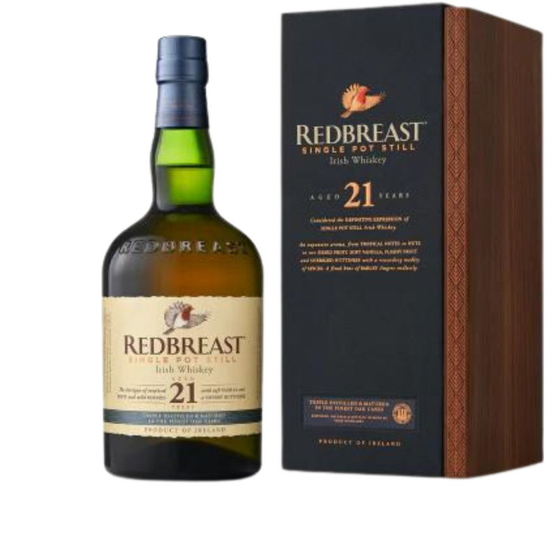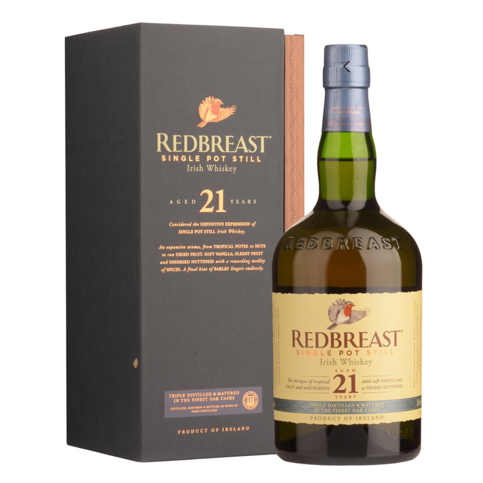Produced in very limited quantities, Redbreast 21 Year Old represents the ultimate expression of Redbreast Single Pot Still Irish Whiskey. The extended ageing process introduces new levels of depth and an abundantly aromatic and fruitful flavour, creating a complex and rewarding whiskey. It is a joy to behold in each and every bottle.